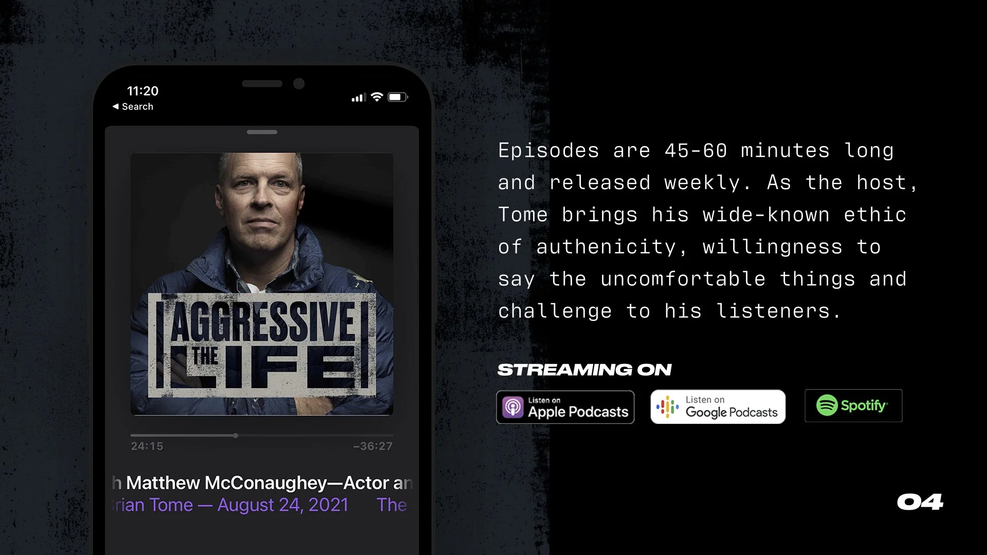 With over 2 million downloads and thousands of weekly listeners, The Aggressive Life with Brian Tome is a video podcast redefining the power of healthy aggression. Brian sits down with guests who don’t settle for passivity—they take life by the horns and make an impact in their spheres of influence. Past guests include Matthew McConaughey, Lecrae, John Mark Comer, and more.